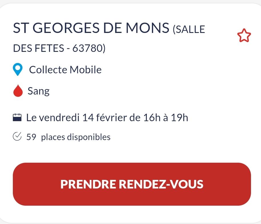 Collecte de sang la 14/02/25 à la salle des fêtes de St Georges à partir de 16 h