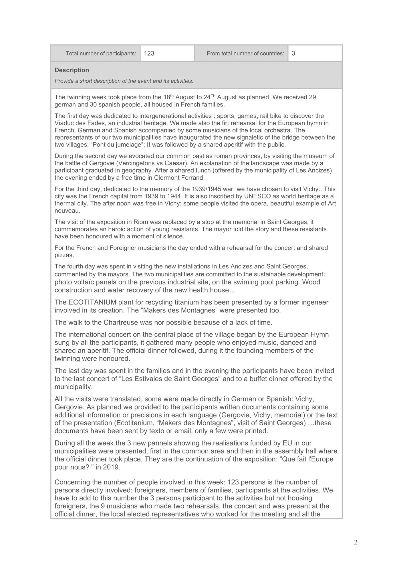 et le 20ème anniversaire de celui avec San Mateo de Gallego (Espagne) Du 18 au 24 août, les communes des Ancizes-Comps et de Saint Georges de Mons ont fêté le trentième anniversaire du jumelage avec Sinzing (Allemagne) et le vingtième anniversaire de celui avec San Mateo de Gallego (Espagne). A cette occasion une trentaine d’allemands et une trentaine d’espagnols ont été accueillis dans des familles, parmi ceux-ci, une vingtaine d’adolescents et d’enfants. Le programme, qui bénéficie d’une subvention européenne, s'articulait autour de plusieurs thématiques : notre histoire commune, le développement durable, le partage d’activités et de moments intergénérationnels. La mémoire commune de la guerre 1939/1945 a été évoquée par une visite de Vichy, « Capitale de l'Etat Français » et un hommage aux résistants devant la plaque commémorative de Saint Georges de Mons. Notre passé commun de "province" romaine a été rappelé au musée de Gergovie. Les maires ont présenté les nouvelles infrastructures de nos communes : (à St Georges les panneaux photovoltaïques permettant une autoconsommation pour une partie de la population locale, aux Ancizes la nouvelle maison de santé, le nouvel Ehpad, la nouvelle mairie et les projets de restructuration de l'école primaire) et l’action de celles-ci pour un développement durable : (construction écoresponsable, recyclage des eaux de pluie pour un usage communal ...) Il y eu bien sûr de nombreux moments conviviaux ouverts à toute la population : après la balade en vélorail, les élus ont inauguré les nouveaux panneaux du « Pont du Jumelage ». La soirée s’est terminée par un apéritif offert par les communes. Un apéritif/concert, ouvert à tous sur la place du Foyer Rural, a précédé le repas officiel du 22. Des membres de l‘Union Musicale en Combrailles et des musiciens étrangers ont animé cet événement. L’ambiance était très joyeuse et marquée par le chant de l'hymne européen en trois langues par les accueillants et hôtes du comité de jumelage. Enfin la rencontre s’est terminée par le Concert de clôture des "Estivales de Saint Georges" En résumé culture, convivialité, musique et beaucoup de bonne humeur. Cette rencontre a reçu des subventions : des communes, du département, du Crédit Agricole et de l’UE. D'autres actions sont prévues d'ici mai 2026 : une projection/débat au cinéma La Viouze, une exposition « bilan » de cette année particulièrement riche en événements en mai 2026, et certainement une soirée festive autour de spécialités auvergnates, espagnoles et allemandes. La prochaine rencontre aura lieu en Espagne, la date envisagée est la semaine du 17 au 23 août 2026. Si vous êtes intéressé(e)s par le jumelage, vous pouvez contacter le comité sur son site : |